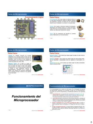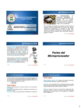 Este documento describe la arquitectura y funcionamiento de los microprocesadores. Explica que el microprocesador es el componente central de una computadora y está compuesto de partes lógicas y físicas. También describe las diferentes unidades de medida como bytes, hertzios y más que se usan para medir las capacidades de los microprocesadores.