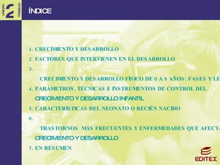 El documento trata sobre el crecimiento y desarrollo infantil. Explica las fases del desarrollo físico de 0 a 6 años, los factores que intervienen en el desarrollo, las características del recién nacido, y los trastornos y enfermedades que pueden afectar el crecimiento. También describe parámetros para medir el desarrollo, leyes de maduración física y el protocolo de actuación ante enfermedades.