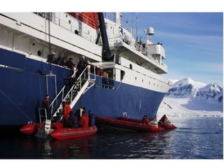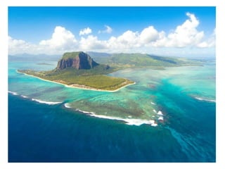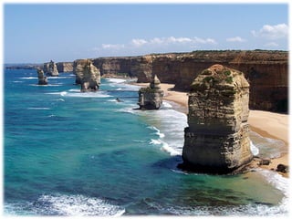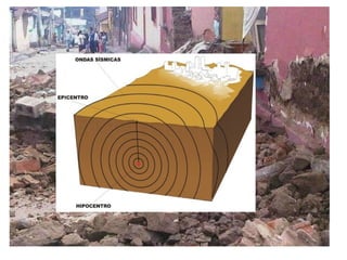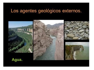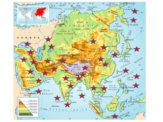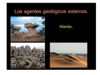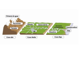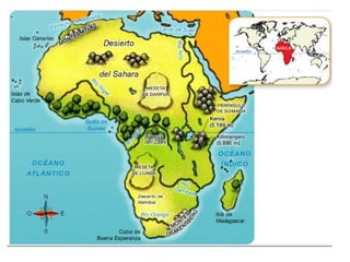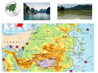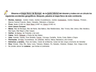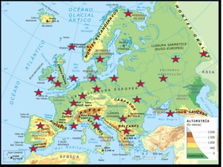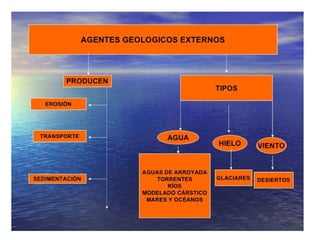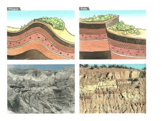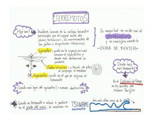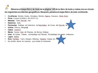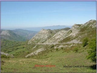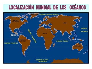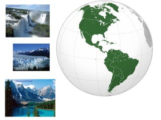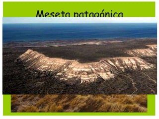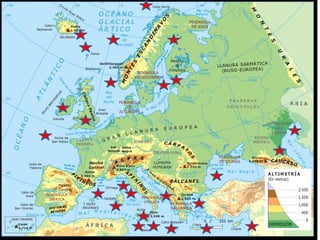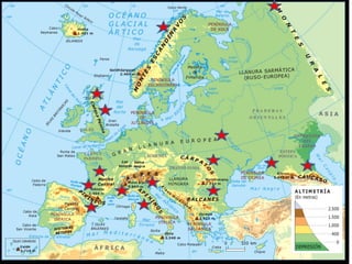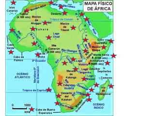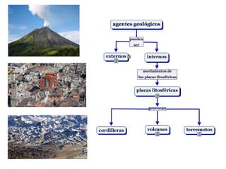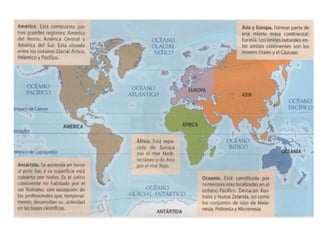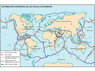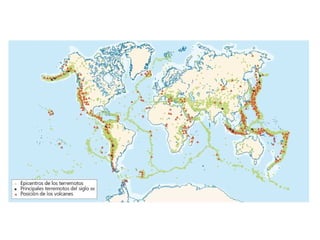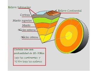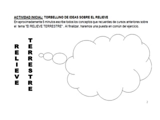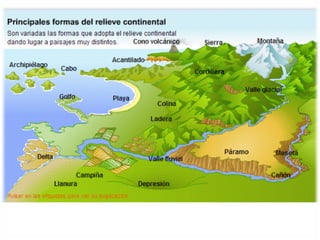 El documento presenta información sobre la formación del relieve terrestre y los movimientos de las placas tectónicas. Incluye tres tipos de movimiento de placas (divergente, convergente y de transformación) y describe ejemplos de cada uno. También resume la teoría de la deriva continental y la formación de los continentes a partir de la fragmentación de Pangea, así como aspectos generales de los principales continentes.