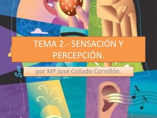 Este documento trata sobre la sensación y percepción. Explica conceptos clave como estímulo y sensación. Describe la percepción como un proceso constructivo que consta de cuatro fases: detección, transducción, transmisión y procesamiento de información. También cubre teorías de la percepción como la teoría asociacionista, la teoría de la Gestalt y la teoría cognitiva. Finalmente, analiza factores que influyen en la percepción y trastornos perceptivos como agnosias, alucinaciones e ilusion