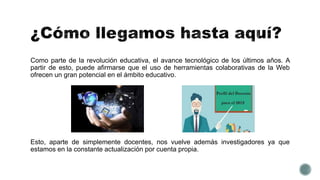 Este documento describe varias herramientas web 2.0 que pueden usarse en educación, incluyendo wikis, blogs, redes sociales, almacenamiento en la nube y aplicaciones móviles. Explica cómo estas herramientas pueden ayudar a compartir material, crear espacios de trabajo colaborativo y almacenar recursos para proyectos. También menciona que las aulas virtuales son un nuevo enfoque educativo que utiliza las TIC para complementar o reemplazar la educación tradicional.