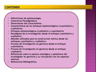 Este documento presenta una introducción a conceptos epistemológicos y metodológicos relevantes para la investigación en gerencia. Define epistemología, ontología y dimensiones del conocimiento. Explica las características de los enfoques cuantitativo y cualitativo, y los paradigmas e métodos asociados a cada uno. También describe los procesos de investigación cuantitativa y cualitativa en gerencia, haciendo énfasis en la importancia de la coherencia paradigmática. Por último, incluye algunas reflexiones sobre la postura ontol