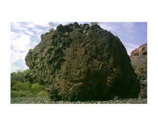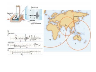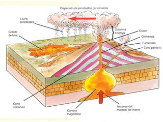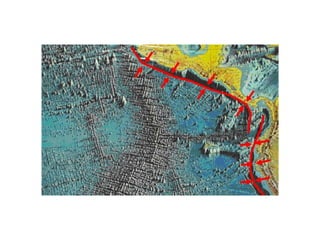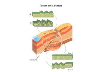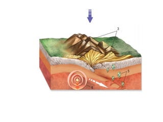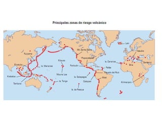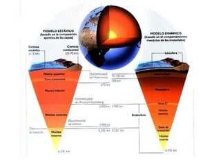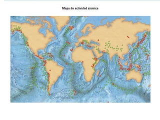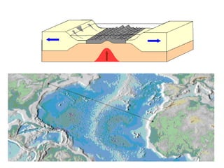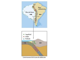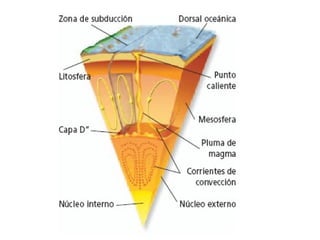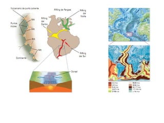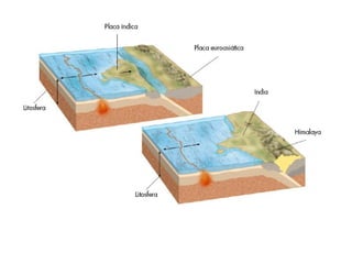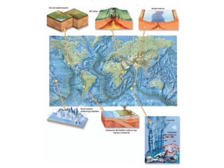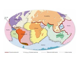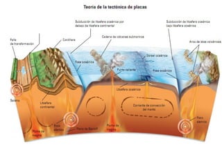 El documento describe los principales conceptos de la tectónica de placas, incluyendo los tipos de límites de placas (constructivos, destructivos y neutros), los motores que mueven las placas, la formación de volcanes, terremotos y dorsales oceánicas. También explica los procesos de subducción cuando placas oceánicas chocan con otras oceánicas o continentales.
