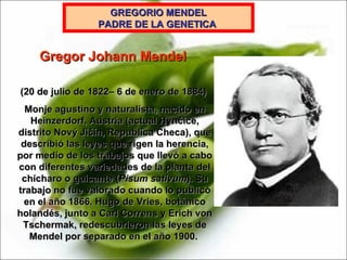 El documento resume los trabajos de Gregor Mendel con guisantes. Mendel realizó cruces controladas entre variedades de guisantes que variaban en características como el color de la flor y forma de la semilla. Observó que las características dominantes aparecían en la primera generación y las recesivas reaparecían en la segunda. A partir de esto dedujo principios como la segregación y recombinación de factores hereditarios. Estos principios explican los patrones de herencia y variación entre generaciones. Los hallazgos de Mendel sentaron las bases de la gené
