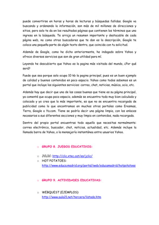 El documento describe varios temas relacionados con las tecnologías de la información y la comunicación (TIC) en la educación. Incluye una discusión sobre diferentes buscadores web como Google, Yahoo y Ask. También describe varios tipos de actividades educativas digitales como juegos educativos, páginas web interactivas y proyectos tecnológicos. Finalmente, analiza cómo los videojuegos pueden usarse como herramientas educativas cuando se eligen adecuadamente y con la guía de padres y maestros.