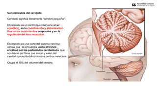 El cerebelo es una parte del sistema nervioso central que interviene en el equilibrio, la coordinación de movimientos y la regulación del tono muscular. Está situado en la fosa cerebral posterior y se divide en dos hemisferios y una porción central llamada vermis. El cerebelo contiene tres lóbulos y está organizado en una corteza externa con tres capas y núcleos profundos que reciben aferencias y envían eferencias a otras áreas.
