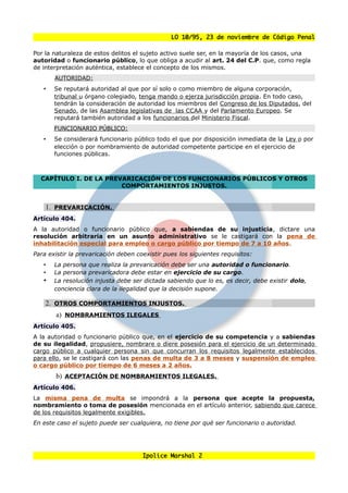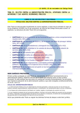 Este documento resume el Título XIX del Código Penal español, que regula los delitos contra la administración pública. El título contiene 10 capítulos que definen delitos como la prevaricación, el abandono de destino, la desobediencia, la denegación de auxilio y otros ataques contra el correcto funcionamiento de la administración pública. El objetivo es proteger los principios de eficacia, jerarquía y legalidad en las actuaciones de las autoridades y funcionarios públicos.