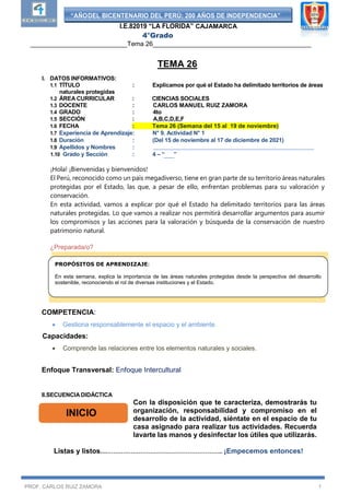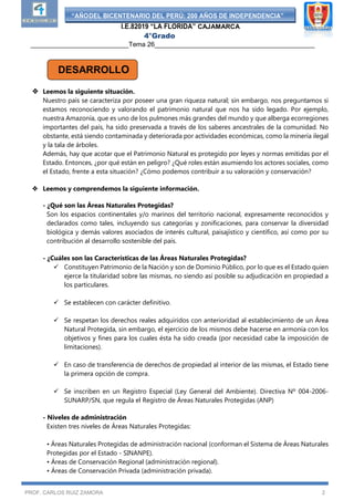 El documento explica por qué el Estado peruano ha delimitado territorios como áreas naturales protegidas. Primero, define las áreas naturales protegidas como espacios continentales y marinos reconocidos por el Estado para conservar la diversidad biológica y valores asociados. Segundo, explica que las áreas naturales protegidas promueven el desarrollo sostenible al mantener ecosistemas saludables que benefician a las personas. Tercero, destaca que estas áreas son importantes para la conservación a largo plazo de especies y procesos
