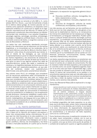Este documento describe la estructura y características del texto expositivo. Explica que su objetivo principal es expresar información o ideas con la intención de mostrar y explicar dicha información de manera comprensible. Luego detalla que la estructura típica de un texto expositivo incluye una introducción, un desarrollo con enumeración o clasificación de ideas principales, y una conclusión. Finalmente, menciona algunos procedimientos comunes utilizados en la explicación como definición, clasificación, ejemplificación y analogía.