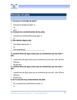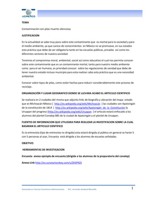 Este documento trata sobre un artículo científico que busca crear conciencia sobre la contaminación por pilas y promover su reciclaje en dos ciudades de Michoacán, México. El artículo se basará en encuestas a estudiantes y entrevistas a la comunidad para determinar el conocimiento actual sobre los contaminantes de las pilas y promover su desecho responsable. El objetivo final es educar e informar a la población sobre los impactos de la contaminación por pilas y la importancia del reciclaje.