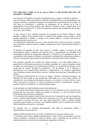 Este documento resume la normativa comunitaria y constitucional sobre igualdad de género en España, así como la Ley Orgánica 3/2007 para la Igualdad Efectiva de Mujeres y Hombres. Describe los principios de igualdad y no discriminación establecidos en los tratados de la UE y la Constitución española. Además, explica los diferentes tipos de discriminación regulados por la ley, como la discriminación directa e indirecta, el acoso sexual y por razón de sexo. Finalmente, resume los criterios generales de actuación de los poderes públicos