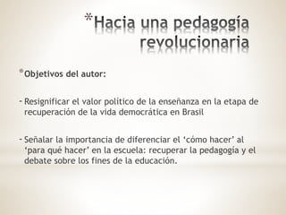 El autor critica la pedagogía nueva por privilegiar la existencia individual sobre la igualdad esencial entre las personas. Defiende una pedagogía tradicional basada en transmitir conocimientos científicos fundamentales para capacitar a las masas para la participación política. Argumenta que cuando más se habló de democracia en las escuelas nuevas, menos democráticas fueron al legitimar desigualdades, y que la escuela debe construir un orden democrático a través de contenidos que promuevan la liberación.