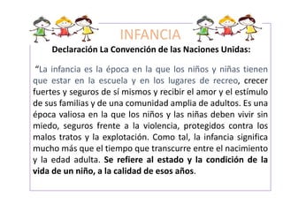 El documento describe la infancia y los derechos de los niños según la Convención de las Naciones Unidas. La Convención define la infancia como un periodo separado de la edad adulta y reconoce que los niños son titulares de sus propios derechos. También exhorta a los gobiernos a apoyar a las familias y evitar la separación de los niños de sus familias. El documento luego discute cómo los niños conceptualizan las enfermedades y cómo las enfermedades pueden afectarlos física y emocionalmente,