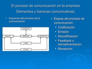 El proceso decomunicación en la empresa. Elementos y barreras comunicativas . Esquema del proceso de la comunicación: Etapas del proceso de comunicación : Codificación Emisión Decodificación Feedback o retroalimentación Recepción