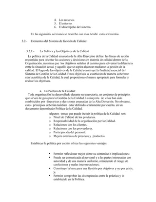 El documento define el sistema de gestión de la calidad y sus elementos clave. Explica que la calidad es el resultado de un trabajo bien hecho y que una organización debe gestionar la calidad de manera sistemática para cumplir con los requisitos de los clientes. Luego describe los elementos fundamentales de un sistema de gestión de la calidad como la política de calidad, los objetivos, los procesos, la organización, los recursos y el desempeño.