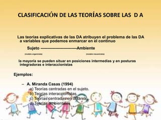 Este documento clasifica y describe varias teorías sobre las dificultades de aprendizaje. Principalmente se dividen en teorías centradas en el sujeto, que atribuyen el problema a factores internos del individuo, y teorías ambientales, que lo atribuyen a factores externos. Dentro de las teorías centradas en el sujeto se incluyen teorías neurofisiológicas, genéticas, de lagunas en el desarrollo y déficits perceptivos o de procesamiento de la información.