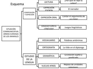 El documento presenta un esquema sobre diferentes temas relacionados con el estudio de la lengua, incluyendo la lectura, la ortografía, el vocabulario, la gramática, la comprensión y expresión oral y escrita. Los temas se dividen en juegos lingüísticos, palabras antónimas, contar argumentos de cómics, situaciones comunicativas sobre animales, el narrador, juegos con el lenguaje, la tilde en diptongos y la oración sujeto-predicado.