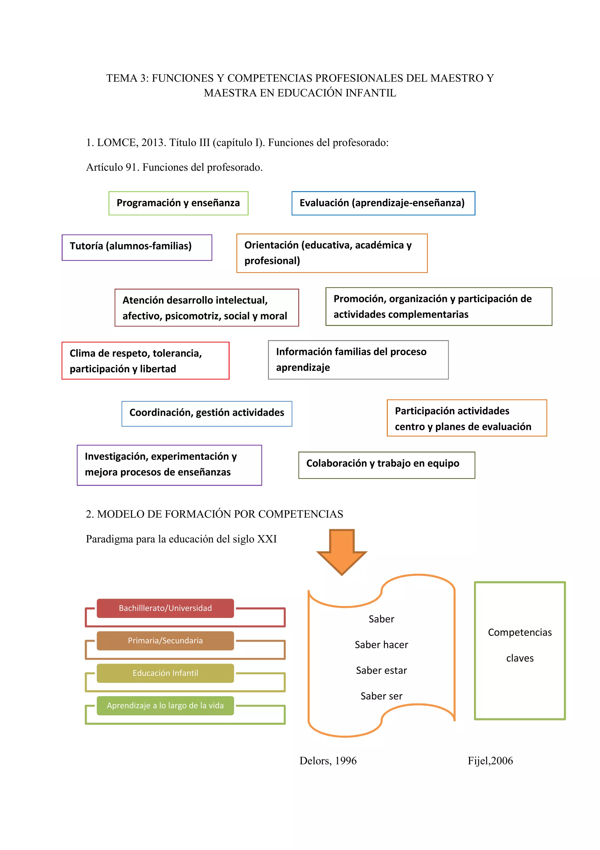 El documento describe las funciones y competencias profesionales del maestro en educación infantil. Explica que las competencias incluyen el saber, saber hacer, saber estar y saber ser. También cubre el paradigma de formación por competencias según Delors y Bachillerato, y las competencias básicas y específicas del maestro según la LOMCE, LOE y el Espacio Europeo de Educación Superior. Finalmente, enumera las ocho competencias clave para el aprendizaje permanente según el Parlamento Europeo.