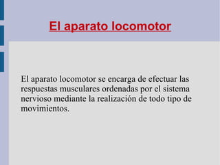 El documento describe el aparato locomotor humano. Este está formado por el esqueleto, compuesto por huesos y cartílagos, y la musculatura. El esqueleto da forma y sostiene el cuerpo, protege órganos internos, y permite el movimiento a través de las articulaciones. La musculatura está formada por músculos que se unen a los huesos y, al contraerse, permiten todo tipo de movimientos. El documento también explica algunas lesiones comunes como fracturas, esguinces y luxaciones.