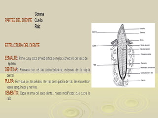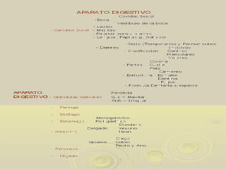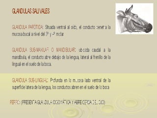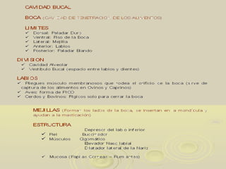 El documento describe la anatomía del aparato digestivo de diferentes especies animales. Explica las características del paladar blando y duro, la lengua, los dientes, las glándulas salivares, la faringe y el esófago. Señala las diferencias entre especies como los equinos, bovinos, cerdos y perros en la forma de la lengua, el tipo de músculo en el esófago y otras características.