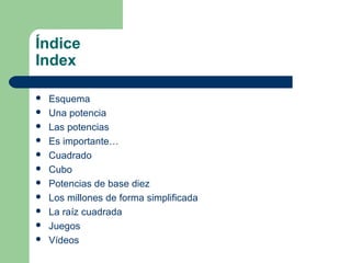 Este documento presenta conceptos básicos sobre potencias y raíces cuadradas. Explica que una potencia es una forma abreviada de expresar una multiplicación con factores iguales y define la base y el exponente. También define cuadrados y cubos y explica cómo leer y escribir potencias. Finalmente, cubre potencias de base diez y cómo expresar números grandes de forma simplificada, así como el concepto de raíz cuadrada y cómo calcularla.