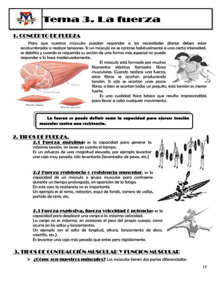 La fuerza se define como la capacidad para ejercer tensión muscular contra una resistencia. Existen diferentes tipos de fuerza como la fuerza máxima, resistencia o explosiva. Los músculos se pueden contraer de forma isométrica, concéntrica o excéntrica. Factores como el volumen muscular, tipo de fibras, entrenamiento y edad afectan los niveles de fuerza de una persona. Para desarrollar fuerza se debe someter a los músculos a resistencias mayores a las que están acostumbrados mediante series de repeticiones con cargas