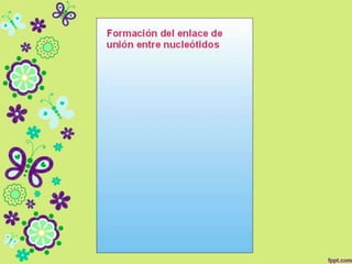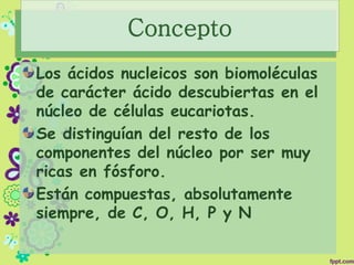 Este documento describe la composición química y estructura de los ácidos nucleicos. Están compuestos de nucleótidos formados por una pentosa, una base nitrogenada y un grupo fosfato. Los nucleótidos se unen en cadenas mediante enlaces fosfodiéster para formar el ADN y el ARN. El ADN existe como doble hélice y contiene desoxirribosa, mientras que el ARN contiene ribosa.