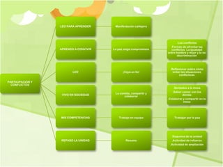 Este documento trata sobre el tema de la participación y los conflictos. Aborda conceptos como los conflictos que surgen cuando hay opiniones e intereses distintos, la importancia del diálogo para resolverlos de forma pacífica, y el derecho a participar en igualdad independientemente de las diferencias. También habla sobre la importancia de colaborar y compartir en familia, como poner y recoger la mesa juntos y comer con buenos modales.