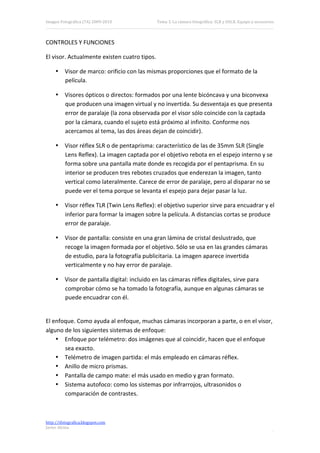Este documento describe los componentes básicos de las cámaras fotográficas SLR y DSLR, incluyendo el obturador, diafragma, objetivo, visor y controles. Explica cómo funcionan estos elementos y cómo afectan a la exposición, profundidad de campo y enfoque de la imagen. También detalla los diferentes tipos de visores, sistemas de enfoque y exposímetros que incluyen estas cámaras.