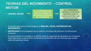 El documento presenta información sobre teorías del control motor. Explica que 1) el control motor implica la regulación del movimiento a través de la transmisión de impulsos nerviosos desde la corteza motora a las unidades motoras, 2) existen varias teorías que intentan explicar la causa y naturaleza del movimiento como la teoría refleja, la teoría jerárquica y la teoría de programación motora, y 3) cada teoría tiene implicancias clínicas diferentes en relación a la evaluación y tratamiento del control motor.