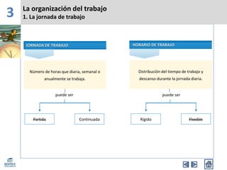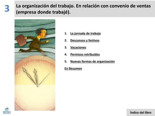 Este documento resume los principales aspectos de la organización del trabajo en una empresa, incluyendo la jornada laboral, los descansos, las vacaciones y los permisos. La jornada máxima es de 40 horas semanales y debe haber al menos 12 horas entre jornadas. Los trabajadores tienen derecho a 15 días mínimos de vacaciones anuales y a varios permisos retribuidos para asuntos familiares, deberes cívicos y formación profesional.