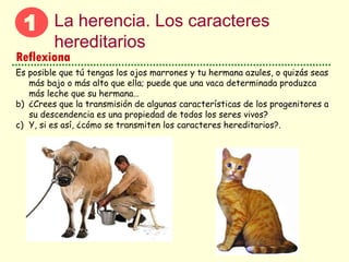 El documento trata sobre la genética y la herencia. Explica que todos los seres vivos transmiten características de los padres a los hijos a través de los cromosomas y los genes. Los cromosomas contienen el ADN y se dividen entre las células hijas durante la división celular, transmitiendo la información genética de generación en generación.