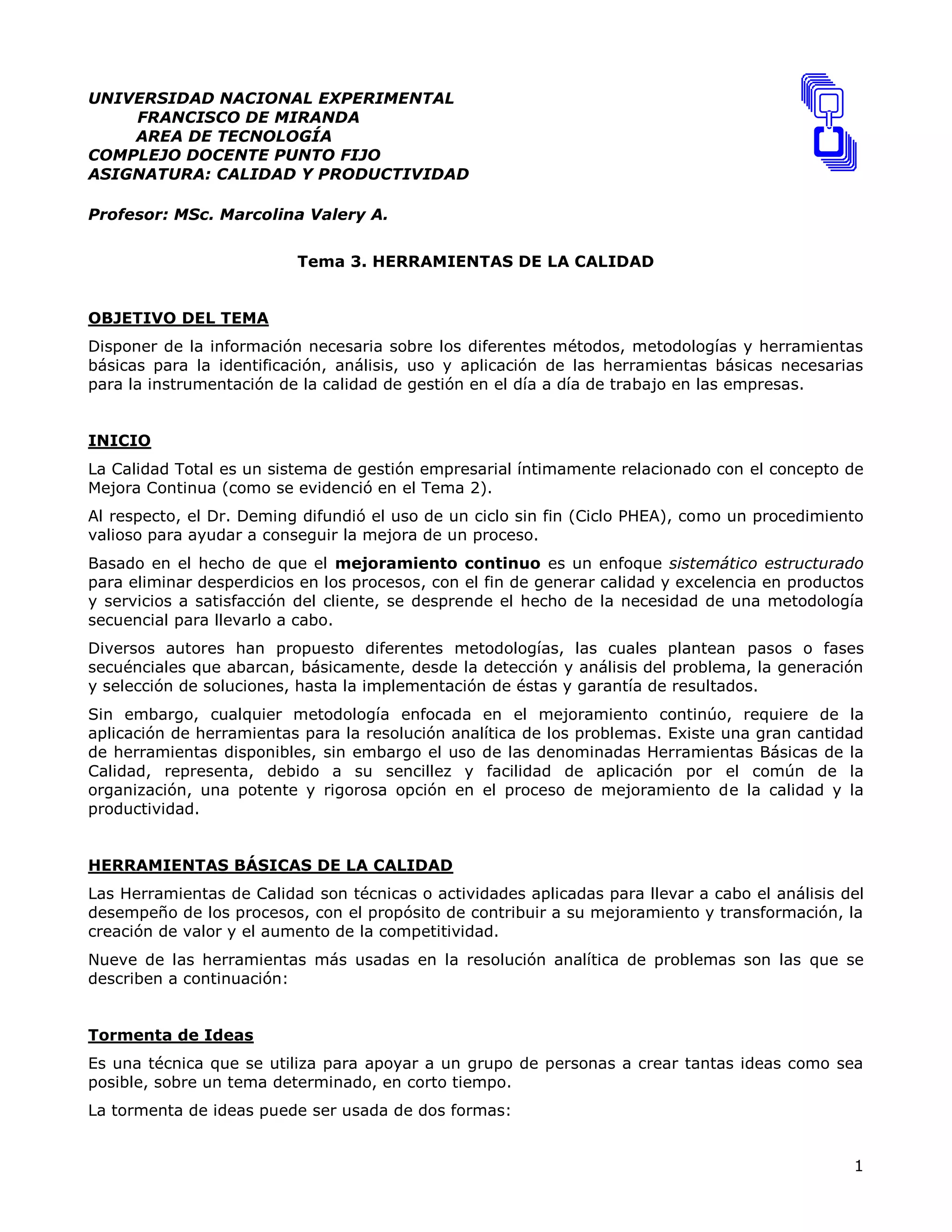 Este documento presenta una introducción a las herramientas básicas de calidad, incluyendo tormenta de ideas, técnica de grupo nominal, diagrama causa-efecto, matriz de selección y diagrama de Pareto. Explica cada herramienta y proporciona ejemplos de su aplicación para resolver problemas relacionados con la variación del sabor del té en una empresa.