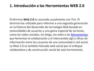 Este documento describe varias herramientas de la Web 2.0 como Google Docs, Gmail, Blogger, Picasa, Google Calendar, gadgets de Blogger, RSS y Delicious. Explica brevemente los servicios y características principales de cada una de estas herramientas colaborativas y de construcción social.