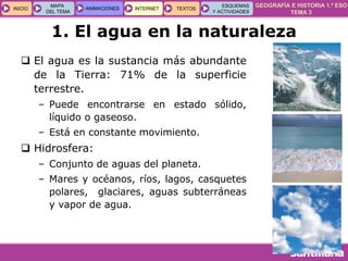 Este documento presenta información sobre los recursos hídricos. Explica que el agua se encuentra en la naturaleza en estado sólido, líquido y gaseoso, y forma parte de la hidrosfera. Describe los ríos, incluyendo sus partes, caudales y formas de relieve. También cubre otros recursos como lagos, aguas subterráneas y glaciares. Incluye imágenes y actividades para los estudiantes.