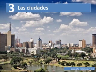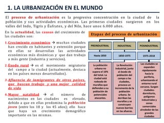 El documento describe la urbanización y las ciudades. Explica que las primeras ciudades surgieron hace unos 6,000 años en los valles del Indo, Tigris y Éufrates, y del Nilo. Actualmente, las principales causas del crecimiento de las ciudades son el crecimiento económico, el éxodo rural, la inmigración y la alta natalidad en las ciudades. También describe los diferentes tipos de asentamientos urbanos como áreas metropolitanas, conurbaciones y megalópolis.