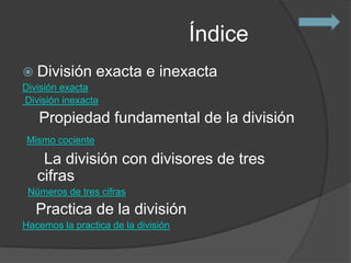 Este documento explica los conceptos de división exacta e inexacta. La división exacta siempre da un resto de cero, mientras que la división inexacta da un resto distinto de cero y menor que el divisor. También cubre la propiedad fundamental de que el cociente no cambia al multiplicar o dividir el dividendo y divisor por el mismo número, y cómo realizar divisiones con divisores de tres cifras.