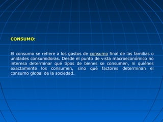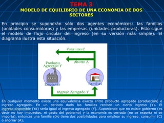 Este documento describe el modelo de equilibrio de una economía de dos sectores. Explica que hay dos agentes económicos: familias (unidades consumidoras) y empresas (unidades productoras). Describe la función de consumo, determinada principalmente por el ingreso de las familias, y la función de ahorro, que es igual al ingreso disponible menos el consumo. También explica que la inversión está compuesta por la inversión bruta fija y las variaciones en las existencias, y es importante para aumentar la capacidad productiva de la economía.