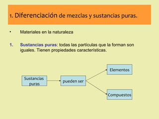 Este documento describe diferentes tipos de materiales, incluyendo sustancias puras, mezclas y disoluciones. Explica que las sustancias puras pueden ser elementos o compuestos, mientras que las mezclas están formadas por dos o más sustancias puras y siempre se pueden separar por métodos físicos. También describe varios métodos para separar mezclas heterogéneas y homogéneas, como la sedimentación, destilación y evaporación. Finalmente, explica las propiedades de las disoluciones, incluida la solubilidad y prop