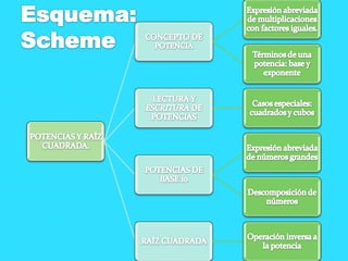 Este documento presenta información sobre potencias y raíces cuadradas. Explica que una potencia es una forma abreviada de expresar una multiplicación de factores iguales, donde la base es el factor que se repite y el exponente indica cuántas veces se multiplica la base. Cubre temas como nombres de potencias comunes, cálculo de potencias de base 10 y la definición de raíz cuadrada.