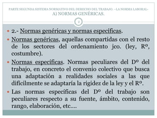 Este documento describe el sistema normativo del derecho del trabajo en España. Explica que existen tres poderes normativos internos: el Estado a través de la legislación y la reglamentación, las partes sociales a través de los convenios colectivos, y las costumbres. También menciona las normas internacionales. Luego detalla las diferentes categorías de normas laborales y los principios constitucionales relacionados con el trabajo establecidos en la Constitución española de 1978.