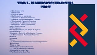 El documento aborda la planificación financiera, destacando su importancia en la gestión empresarial, así como sus objetivos, partes del proceso y herramientas empleadas. Se centra en la proyección de situaciones financieras futuras mediante la elaboración de presupuestos y el control de recursos, para minimizar riesgos y aprovechar oportunidades. Se subraya la necesidad de una planificación estructurada que integre diversas áreas de la empresa para alcanzar objetivos económicos específicos.