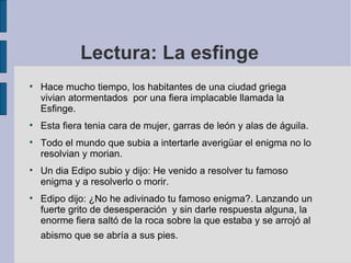 El documento habla sobre la esfinge de la mitología griega, una fiera con cara de mujer, garras de león y alas de águila que planteaba un enigma a los que subían a la roca donde estaba. Quien no resolvía el enigma moría. Un día, Edipo subió y resolvió el enigma, haciendo que la esfinge se arrojara por el acantilado.
