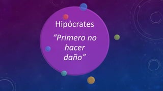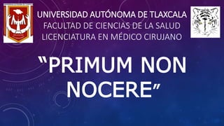 El documento aborda el principio de 'primum non nocere' en la práctica médica, enfatizando la obligación de los médicos de no causar daño a sus pacientes y prevenir complicaciones iatrogénicas. Se discute la ética médica, las consecuencias del daño y cómo su aceptación no excusa la necesidad de evitarlo, presentando alternativas para reducir el riesgo y promover el bienestar del paciente. Finalmente, se plantea la importancia de la vigilancia comunitaria y la participación activa del paciente en su tratamiento como estrategias para minimizar daños y mejorar la atención médica.