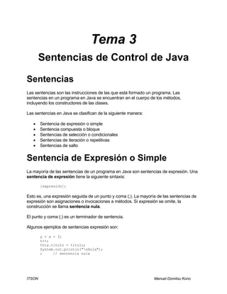 Este documento describe los diferentes tipos de sentencias en Java, incluyendo: sentencias de expresión, sentencias compuestas, sentencias condicionales (if y switch), sentencias repetitivas (while, for, do-while), y sentencias de salto. Explica la sintaxis y funcionamiento de cada tipo de sentencia a través de ejemplos.