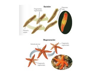 Este documento trata sobre la reproducción asexual y sexual. La reproducción asexual produce descendientes idénticos al progenitor a través de procesos como la gemación y la fragmentación. La reproducción sexual involucra a dos progenitores y produce descendientes con una combinación de características de ambos padres a través de procesos como la fecundación, el desarrollo embrionario y el crecimiento de las crías. La reproducción sexual aumenta la variabilidad genética.