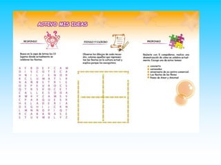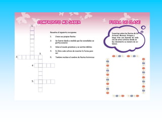 Este documento describe una lección sobre las fiestas y la felicidad. La lección busca promover el desarrollo integral de los estudiantes mediante actividades que exploran el significado y propósito de las fiestas culturales y religiosas. Las actividades incluyen definir términos clave, crear artículos y representaciones visuales sobre celebraciones religiosas, y discutir cómo las fiestas pueden hacer que las personas se sientan felices. La evaluación considerará la participación de los estudiantes, el desarrollo de habilidades y el