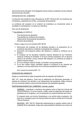 El documento describe la estructura y funciones del gobierno en España. El gobierno ejerce el poder ejecutivo y está dirigido por el presidente del gobierno. El gobierno está compuesto por el presidente y los ministros, quienes son nombrados y removidos por el rey a propuesta del presidente. El gobierno es responsable ante el Congreso de los Diputados y puede perder la confianza a través de una moción de censura.