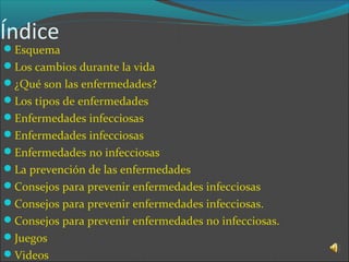 Este documento resume los diferentes tipos de enfermedades, incluyendo enfermedades infecciosas causadas por microbios y enfermedades no infecciosas causadas por otros factores como mala alimentación o accidentes. También proporciona consejos para prevenir ambos tipos de enfermedades, como mantener una buena higiene, llevar una dieta saludable y hacer ejercicio regularmente. Finalmente, incluye enlaces a juegos y videos relacionados con la salud.
