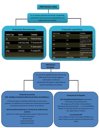 El documento describe varios protocolos de red importantes como Unix, NetWare, AppleTalk, EtherTalk y SMB. Estos protocolos permiten compartir recursos como archivos e impresoras entre usuarios y equipos en una red. Cada sistema operativo utiliza protocolos específicos para administrar la red y comunicarse entre nodos.